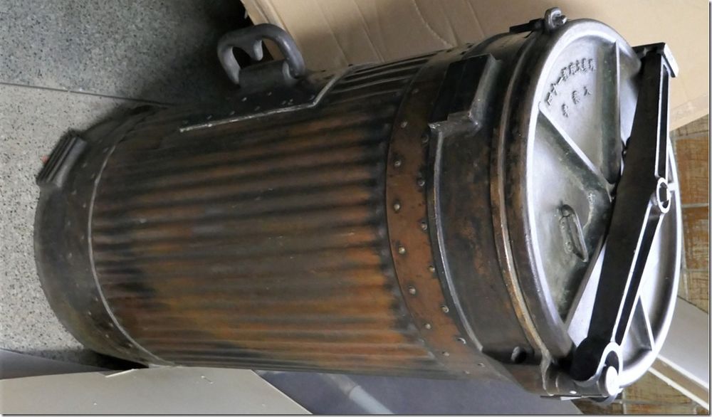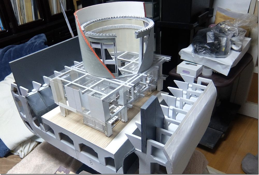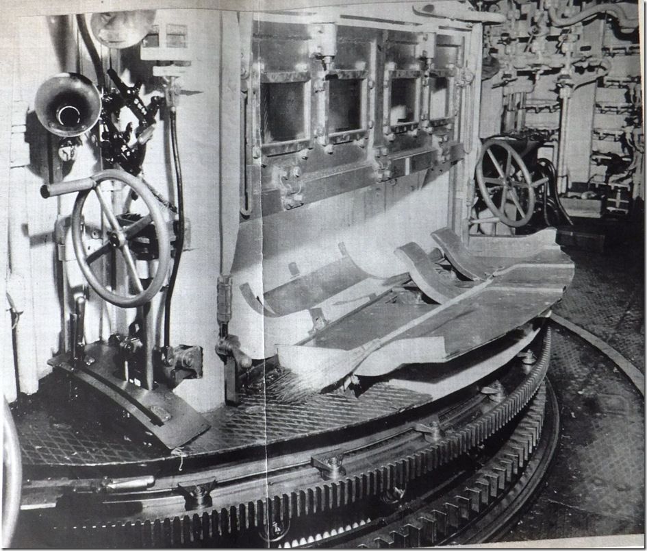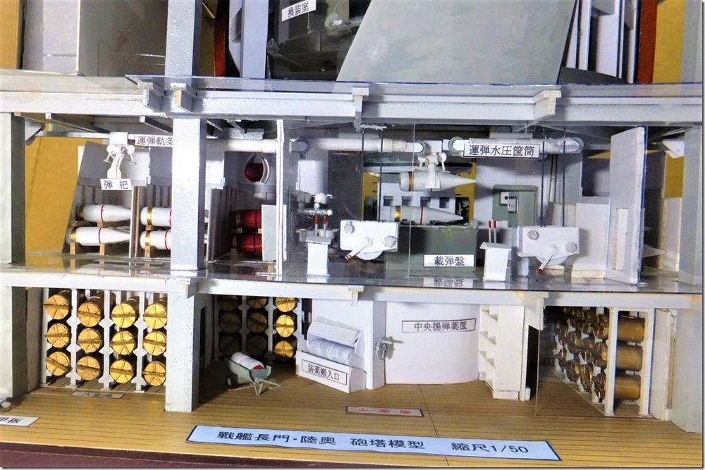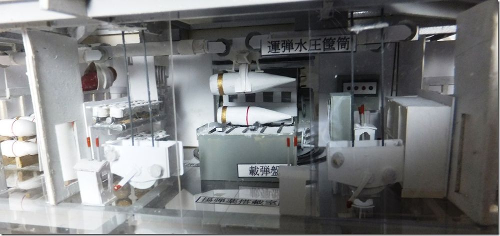艦の会でお会いした、A様からの貴重な写真のお便りです。 別枠で掲載します。 2026.2.12 長門型戦艦の砲塔構造模型 模型と実物の砲塔との比較をまとめてみましたので御覧下さい。 長門型戦艦の砲塔構造模型(縮尺 1:50) ![]() 砲 室 側壁面には木製の工具箱 と、装填用の小型クレーンが設置 左砲の前方側面に左砲俯仰手席、 中央に旋回手席、 右砲の前方側面に右砲手席、 後部に砲台長席 その前の棚に発砲用の「火門管」が収納 尾栓の後部下に「装填架」(砲尾揚弾薬匡と砲身との橋渡し連結具) ![]() 「 砲尾揚弾薬匡」 昭和11年の改装時にそれまでの「三段落下式」が「上下二段式」に改造されて上段が装薬、下段に砲弾が搭載される。 これが下から上がって来て上部の曲り金が「装填架」を押し上げ、3馬力の水力発動機が瞬時に働き「連鎖装填機」の装填悍が突き出され、砲身内に砲弾と装薬が装填される。 此の二段式弾薬匡が考案された事で装填秒時が短縮された。 ![]() 製作中の船体断面模型と砲塔構造 ![]() 砲塔の最下階に在る「火薬庫」、 「弾庫」、 「中央揚弾薬室」 ![]() 「中央揚弾薬室」 手前に「載弾盤」(運ばれて来た砲弾が一旦これに載せられ、次に左右に旋回する 「運弾盤」へ押し出し載せられ、「中央揚弾薬匡」の開いた扉の中へ落とし込まれる) 天井に運弾用「水圧匡筒」 手動の運弾機構(手回しワイヤーで運ぶ) 動力盤など ![]() 「弾 庫」 砲弾(1,000kg)は上部の「弾杷」が挟んで吊り上げて「運弾軌条」 (レール)に沿って運ばれる 砲弾は横ぶれの無いように壁面の「立て枠」の間に横向きに収納され 木製の台座の上に水平に寝かせられた。 此の砲弾模型は「一式徹甲弾」で、隣の区画に「三式弾」(対空弾)が有る ![]() 火薬庫と揚薬匡(円形の囲い) 装薬運搬車(一輪車) ![]() 「火薬庫」 此の真鍮製の火薬缶(80kg)に装薬(30kg)が2袋収納されて火薬棚に格納される。 庫内の壁や床面には静電気防止対策の為に木板が張られ、「火薬缶」は若干手前に 傾けられ、缶の蓋を専用の鍵で開けて装薬を次々に手前に滑り出し、「中央揚薬匡」 まで台車(一輪車)に乗せて運ぶ 昭和18年に生じた「戦艦陸奥」の爆沈は装薬の自然発火説と放火説が有りますが、 仮に放火で有ったと仮定すれば 此の火薬庫に入って専用の鍵で火薬缶の蓋を開け装薬袋を取出して切り裂き火薬を床面にばらまいて、遅延の為に火縄に点火、その後、侵入した砲塔に戻った、と、なりますが、此の模型で其の「経路」を辿る事が出来ます。 此れは砲塔の勤務者のみが知る経路で、「中央揚弾薬匡」に併設した点検通路が垂直に砲塔から火薬庫までも繋がって居り、壁面のタラップを伝って降りて行くと最下部は火薬庫の装薬袋を「中央揚弾薬匡」に投入する為の「円形の壁に囲まれた場所」で、此の壁に点検口が有り、それを開けて火薬庫の内部に出ることが出来ます。 戦前は其の原因が突き止めら無かったようで此の様な火薬庫の爆発事故が生じましたが、戦後の海上自衛隊では装薬の経年劣化に対応して定期的な入れ替えを行う事に依り、斯様な爆発事故は起きた事が有りません。 靖国神社遊就館に献納された41糎砲「火薬缶」 蓋の中央に有る突起物を所定の鍵で回して緩め、横向きの「固定レバー」を外して蓋を開ける ![]() 戦艦の「砲塔構造」は極めて厳重な国家の「軍事機密」として一般の海軍兵さえも其の目に触れる事が無く、 砲塔勤務者は「横須賀海軍砲術學校」で普通科、高等科の上位に在る最難関の「特修科」終了生のみが就くことが出来る特別な配置で有り、極めて優秀な兵員が任ぜられた、との事です。 その為か詳しい様子を知る人物は少なく、広島県江田島の旧「海軍兵学校」には戦前から生徒教育の為に据えられた「戦艦陸奥」の砲塔が今でも存在して居りますが、此れには往年の「海軍砲術學校」に相当する海上自衛隊「第一術科學校」でさえも関心が薄いようで、最初に内部を調査見学したのは私個人のみでした。 暑い真夏の日中に真っ暗な砲塔の中に入って、「第一術科學校」から借用した「サーチライト」で照らし出されたのは、直径が私の背丈(1.7m)を越す大きなお化けの様な大砲でした。 此れが完成した当時は世界最大の艦載砲で、此の砲(130トン)及び砲塔の俯仰旋回、砲弾の装填など全ての動力には艦内の機関室に設置された「蒸気タービン」が駆動する「高圧ポンプ」から供給される超高圧水が(82kg/cm2)使われて居りました。 当時の世界は「大艦巨砲主義」の時代で、我が国は世界の「三大海軍国」として君臨し、此の様に巨大な軍艦を多数保有する事で英米の両大国に対峙していたのです。今日では到底考えられません。 此の「長門型戦艦」の砲塔模型は過って此の砲塔内部を調べたことに基づいて製作したものですが、現代では半径150km以内の敵艦に対し100%の命中率を誇る「誘導ミサイル」が主要な兵器で有り、このような大口径火砲は既に無用のものと化し、現在の海上自衛隊では「古代鉄砲」と陰口を言われて