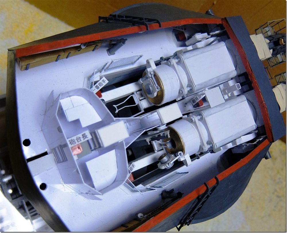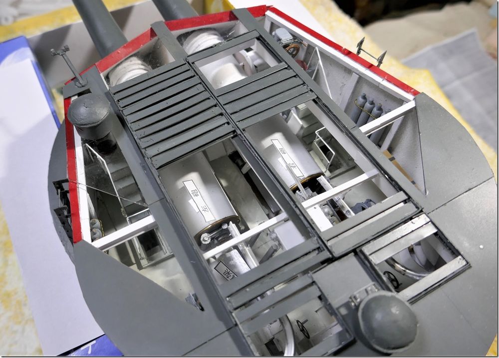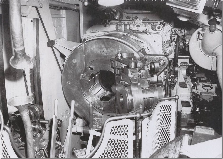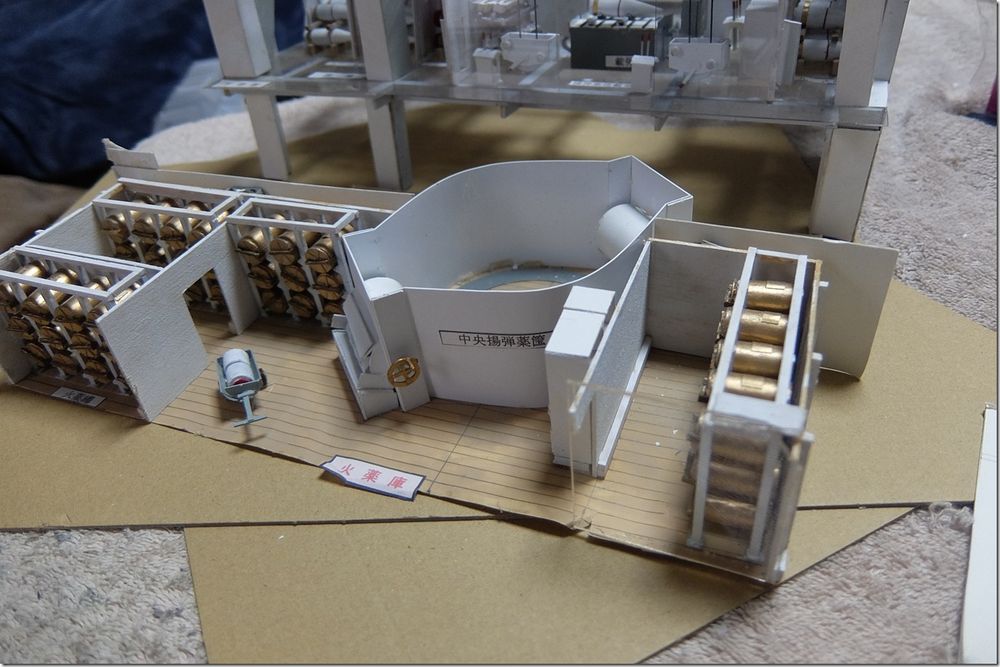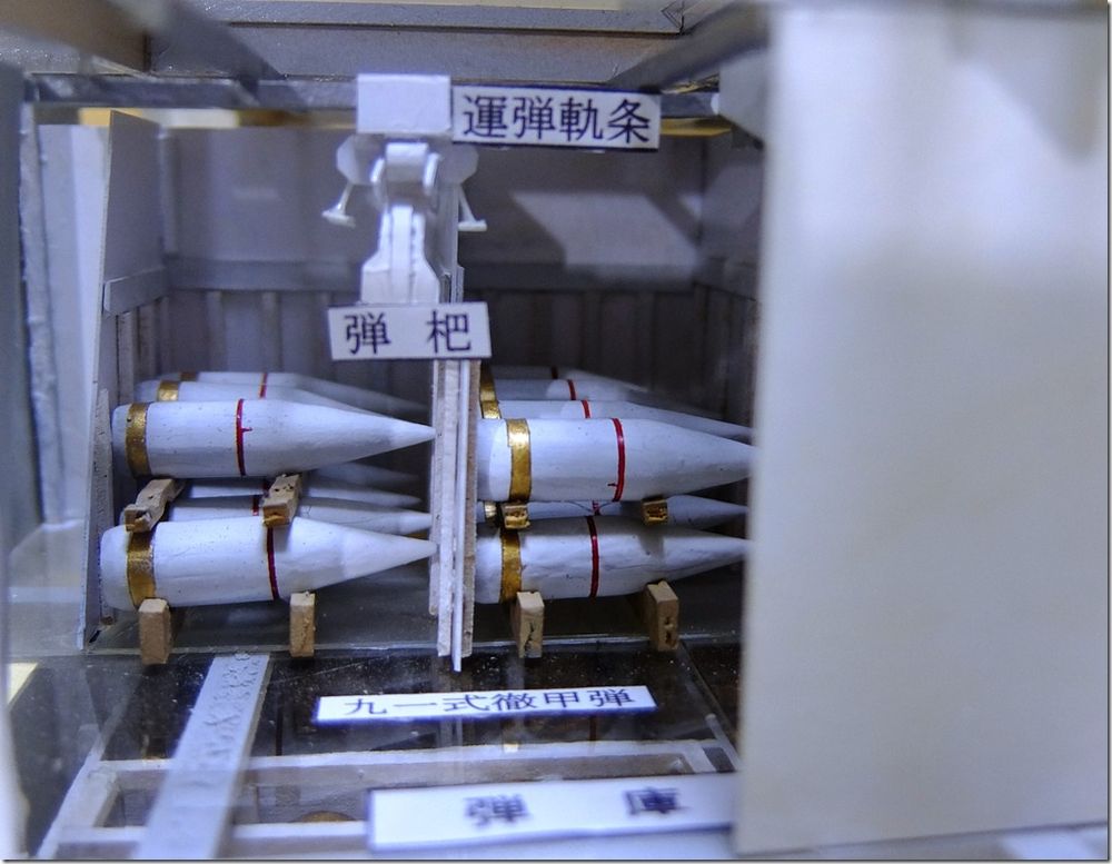 艦の会でお会いした、A様からの貴重な写真のお便りです。 別枠で掲載します。 2026.2.12 長門型戦艦の砲塔構造模型 模型と実物の砲塔との比較をまとめてみましたので御覧下さい。 長門型戦艦の砲塔構造模型(縮尺 1:50) ![]() 砲 室 側壁面には木製の工具箱 と、装填用の小型クレーンが設置 左砲の前方側面に左砲俯仰手席、 中央に旋回手席、 右砲の前方側面に右砲手席、 後部に砲台長席 その前の棚に発砲用の「火門管」が収納 尾栓の後部下に「装填架」(砲尾揚弾薬匡と砲身との橋渡し連結具) ![]() 「 砲尾揚弾薬匡」 昭和11年の改装時にそれまでの「三段落下式」が「上下二段式」に改造されて上段が装薬、下段に砲弾が搭載される。 これが下から上がって来て上部の曲り金が「装填架」を押し上げ、3馬力の水力発動機が瞬時に働き「連鎖装填機」の装填悍が突き出され、砲身内に砲弾と装薬が装填される。 此の二段式弾薬匡が考案された事で装填秒時が短縮された。 ![]() 製作中の船体断面模型と砲塔構造 ![]() 砲塔の最下階に在る「火薬庫」、 「弾庫」、 「中央揚弾薬室」 ![]() 「中央揚弾薬室」 手前に「載弾盤」(運ばれて来た砲弾が一旦これに載せられ、次に左右に旋回する 「運弾盤」へ押し出し載せられ、「中央揚弾薬匡」の開いた扉の中へ落とし込まれる) 天井に運弾用「水圧匡筒」 手動の運弾機構(手回しワイヤーで運ぶ) 動力盤など ![]() 「弾 庫」 砲弾(1,000kg)は上部の「弾杷」が挟んで吊り上げて「運弾軌条」 (レール)に沿って運ばれる 砲弾は横ぶれの無いように壁面の「立て枠」の間に横向きに収納され 木製の台座の上に水平に寝かせられた。 此の砲弾模型は「一式徹甲弾」で、隣の区画に「三式弾」(対空弾)が有る ![]() 火薬庫と揚薬匡(円形の囲い) 装薬運搬車(一輪車) ![]() 「火薬庫」 此の真鍮製の火薬缶(80kg)に装薬(30kg)が2袋収納されて火薬棚に格納される。 庫内の壁や床面には静電気防止対策の為に木板が張られ、「火薬缶」は若干手前に 傾けられ、缶の蓋を専用の鍵で開けて装薬を次々に手前に滑り出し、「中央揚薬匡」 まで台車(一輪車)に乗せて運ぶ 昭和18年に生じた「戦艦陸奥」の爆沈は装薬の自然発火説と放火説が有りますが、 仮に放火で有ったと仮定すれば 此の火薬庫に入って専用の鍵で火薬缶の蓋を開け装薬袋を取出して切り裂き火薬を床面にばらまいて、遅延の為に火縄に点火、その後、侵入した砲塔に戻った、と、なりますが、此の模型で其の「経路」を辿る事が出来ます。 此れは砲塔の勤務者のみが知る経路で、「中央揚弾薬匡」に併設した点検通路が垂直に砲塔から火薬庫までも繋がって居り、壁面のタラップを伝って降りて行くと最下部は火薬庫の装薬袋を「中央揚弾薬匡」に投入する為の「円形の壁に囲まれた場所」で、此の壁に点検口が有り、それを開けて火薬庫の内部に出ることが出来ます。 戦前は其の原因が突き止めら無かったようで此の様な火薬庫の爆発事故が生じましたが、戦後の海上自衛隊では装薬の経年劣化に対応して定期的な入れ替えを行う事に依り、斯様な爆発事故は起きた事が有りません。 靖国神社遊就館に献納された41糎砲「火薬缶」 蓋の中央に有る突起物を所定の鍵で回して緩め、横向きの「固定レバー」を外して蓋を開ける ![]() 戦艦の「砲塔構造」は極めて厳重な国家の「軍事機密」として一般の海軍兵さえも其の目に触れる事が無く、 砲塔勤務者は「横須賀海軍砲術學校」で普通科、高等科の上位に在る最難関の「特修科」終了生のみが就くことが出来る特別な配置で有り、極めて優秀な兵員が任ぜられた、との事です。 その為か詳しい様子を知る人物は少なく、広島県江田島の旧「海軍兵学校」には戦前から生徒教育の為に据えられた「戦艦陸奥」の砲塔が今でも存在して居りますが、此れには往年の「海軍砲術學校」に相当する海上自衛隊「第一術科學校」でさえも関心が薄いようで、最初に内部を調査見学したのは私個人のみでした。 暑い真夏の日中に真っ暗な砲塔の中に入って、「第一術科學校」から借用した「サーチライト」で照らし出されたのは、直径が私の背丈(1.7m)を越す大きなお化けの様な大砲でした。 此れが完成した当時は世界最大の艦載砲で、此の砲(130トン)及び砲塔の俯仰旋回、砲弾の装填など全ての動力には艦内の機関室に設置された「蒸気タービン」が駆動する「高圧ポンプ」から供給される超高圧水が(82kg/cm2)使われて居りました。 当時の世界は「大艦巨砲主義」の時代で、我が国は世界の「三大海軍国」として君臨し、此の様に巨大な軍艦を多数保有する事で英米の両大国に対峙していたのです。今日では到底考えられません。 此の「長門型戦艦」の砲塔模型は過って此の砲塔内部を調べたことに基づいて製作したものですが、現代では半径150km以内の敵艦に対し100%の命中率を誇る「誘導ミサイル」が主要な兵器で有り、このような大口径火砲は既に無用のものと化し、現在の海上自衛隊では「古代鉄砲」と陰口を言われて